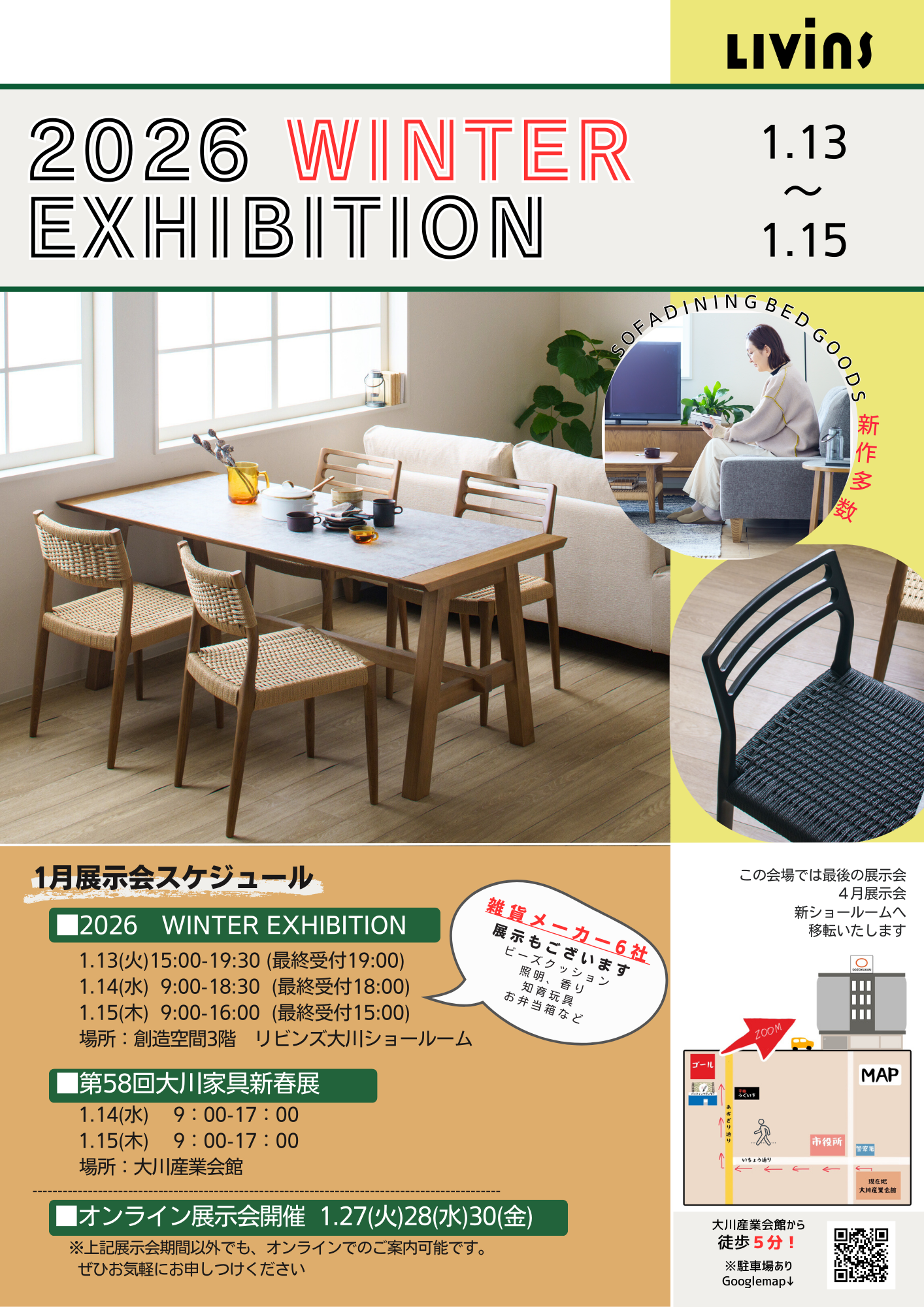 大川ショールーム、大川産業会館の2会場で1月展示会を開催いたします。