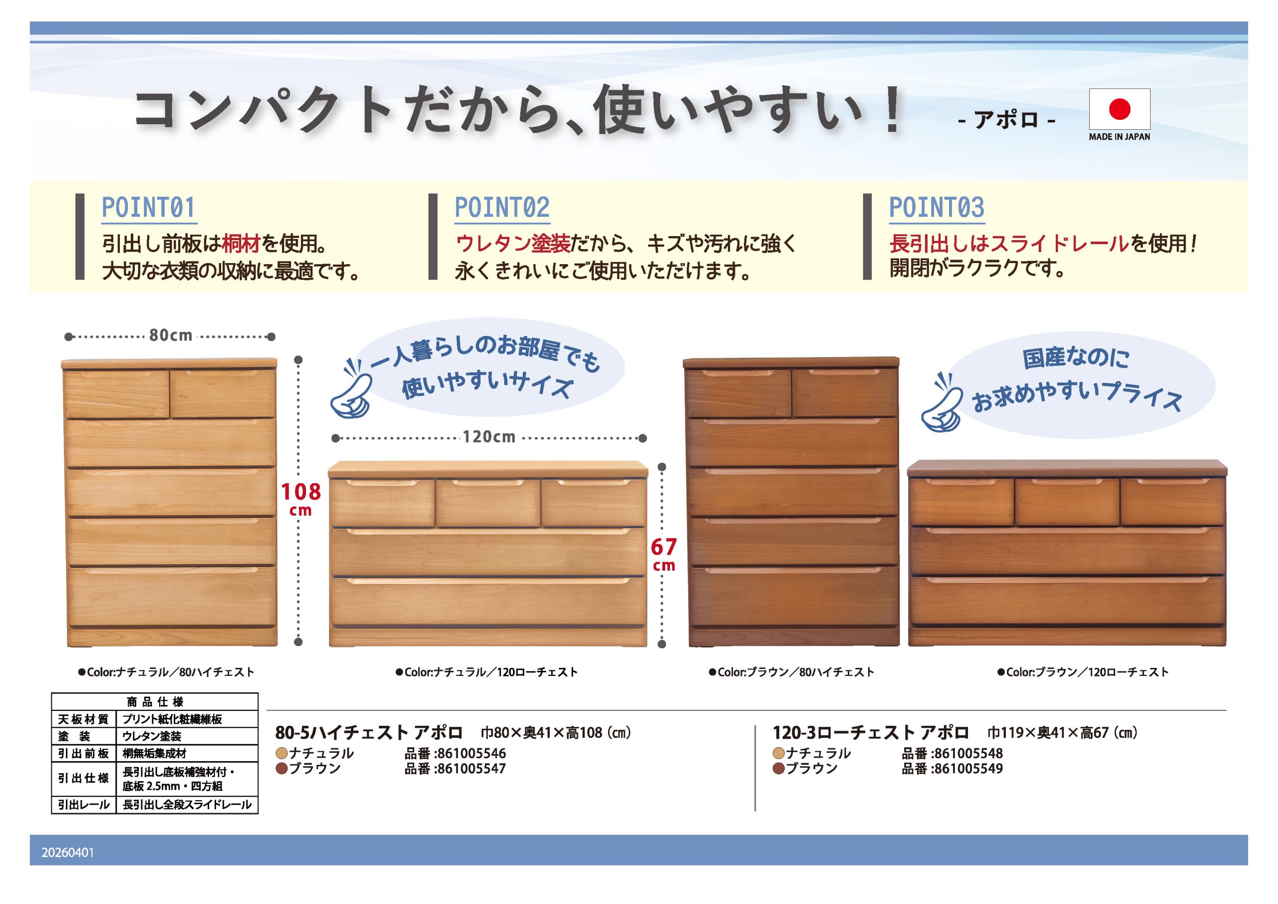 天然木の桐材を使用したシンプルなチェスト。 一人に一台、お手軽プライスチェスト!