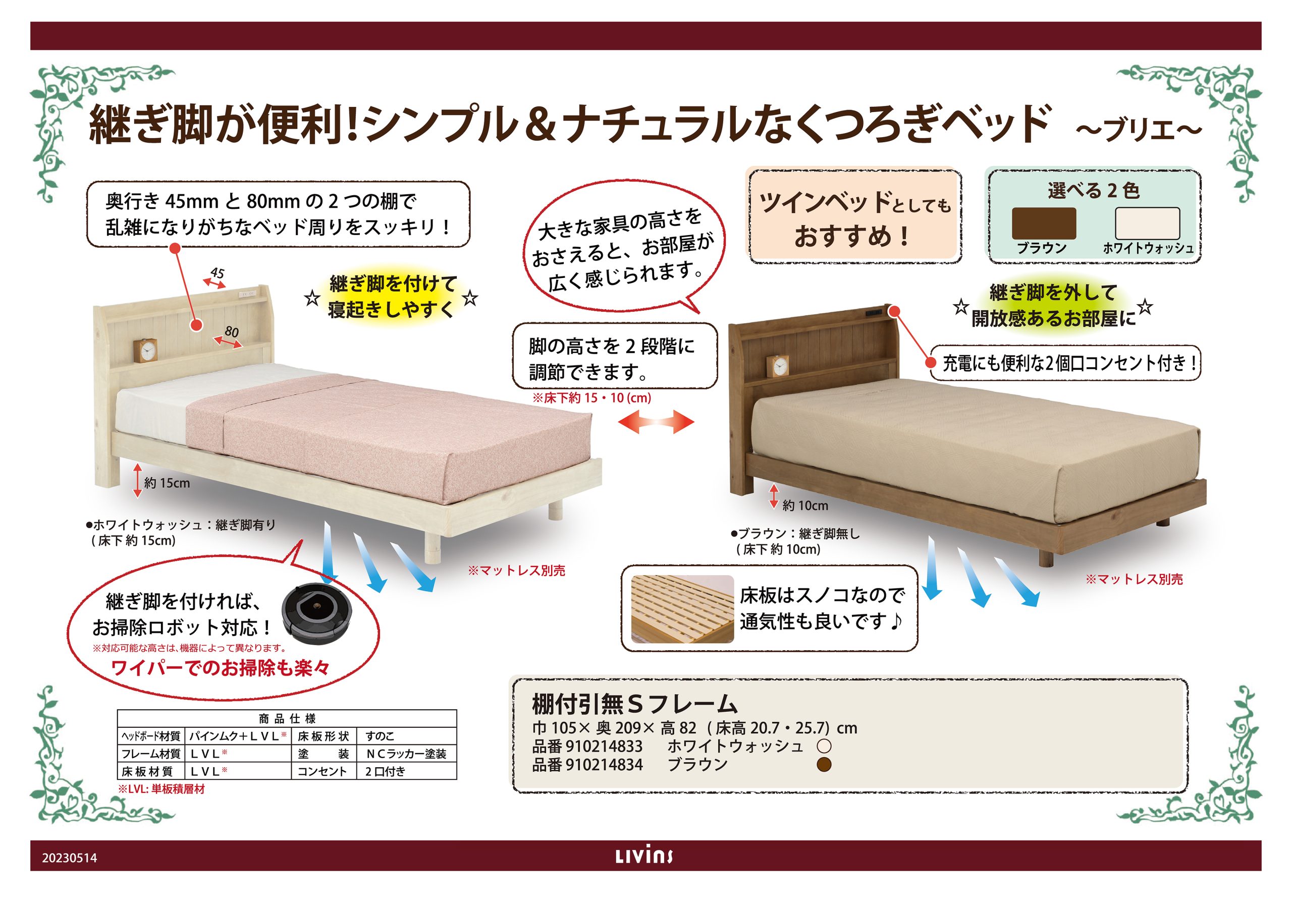 シンプルデザインの棚付ベッド。 2段棚と便利な2口コンセント付き。 2台並べてもスッキリ収まります。 継ぎ脚で高さを2段階調整できます。
