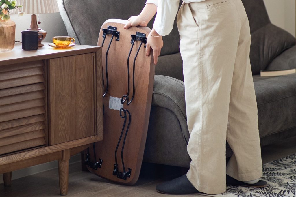 天然木のコンパクトな折りたたみテーブル。