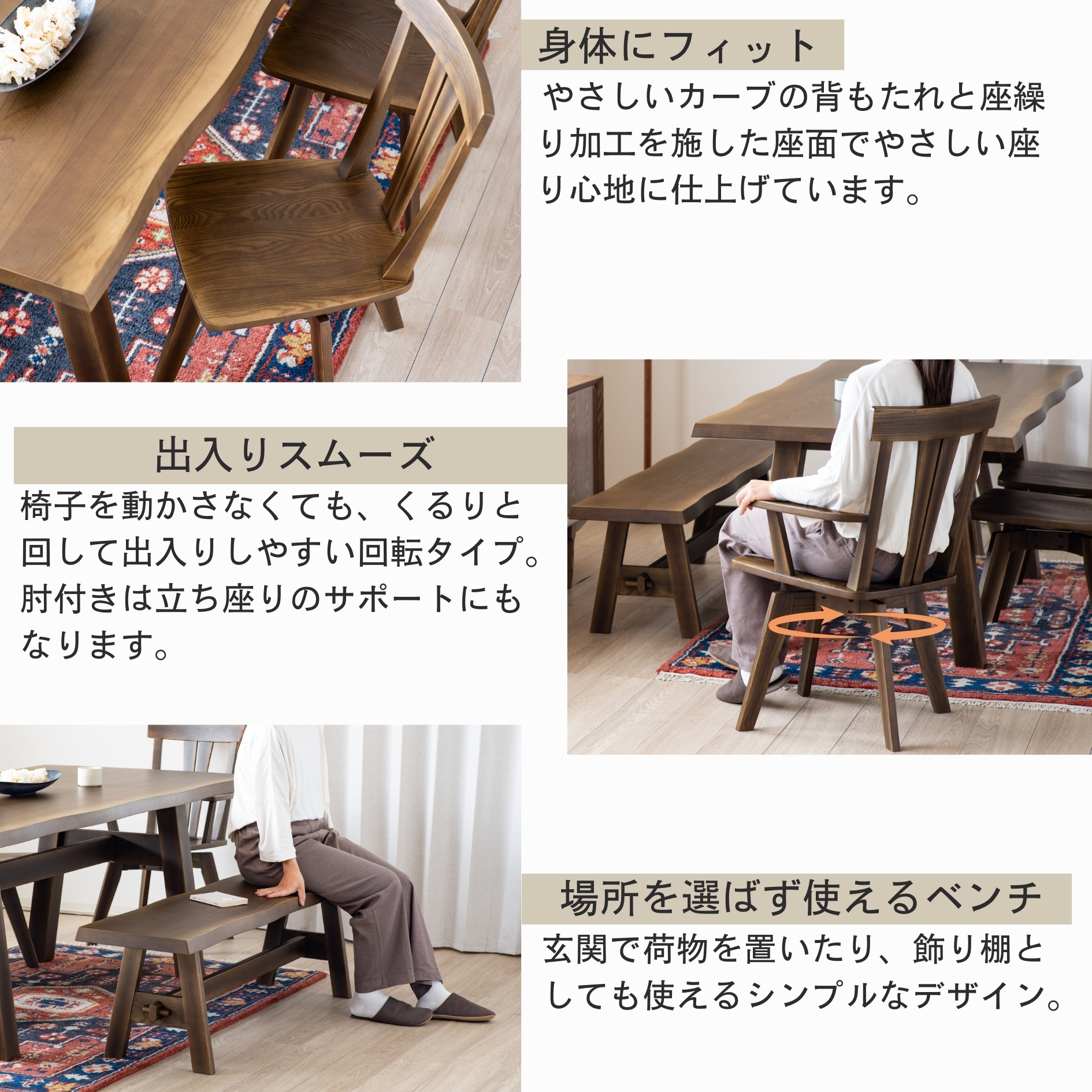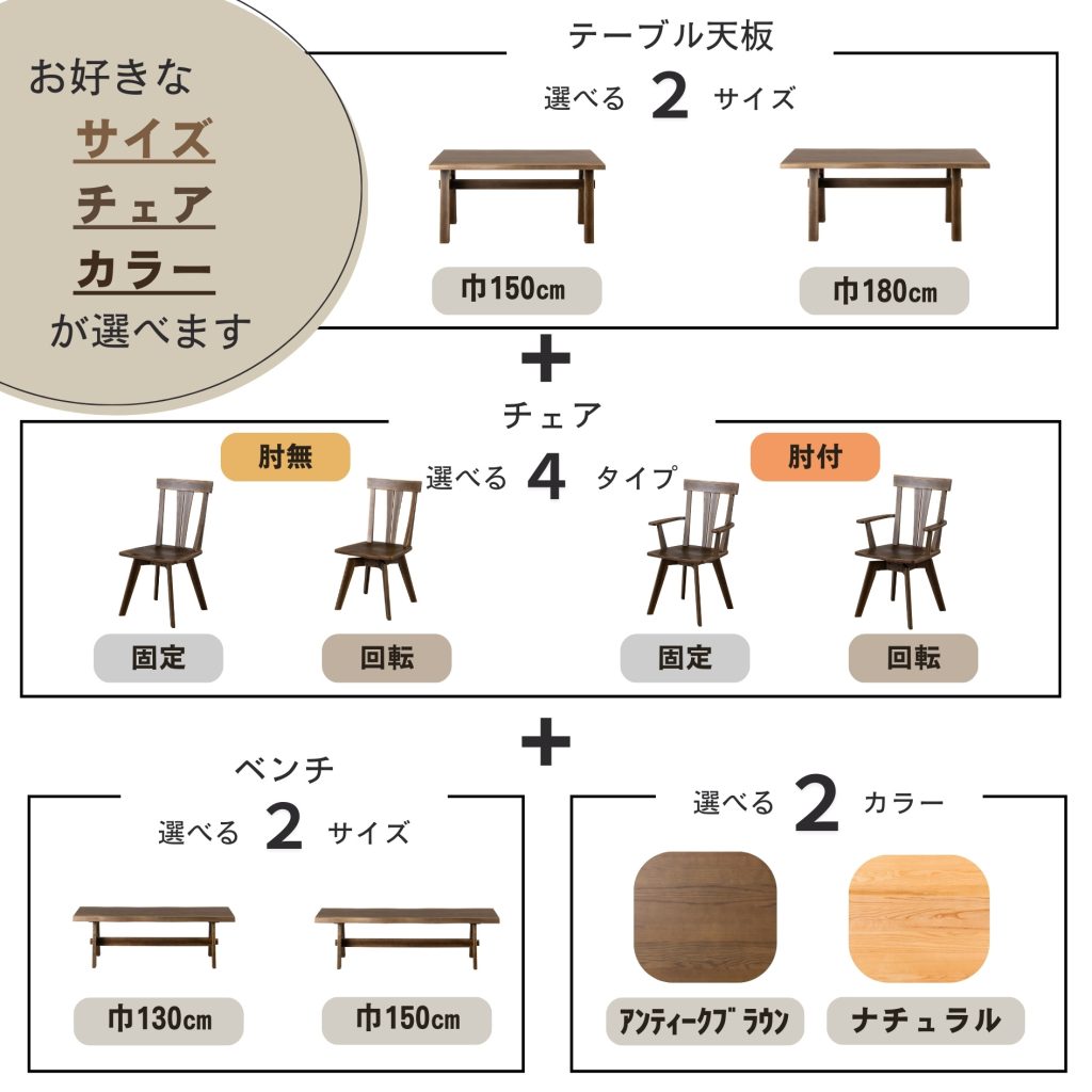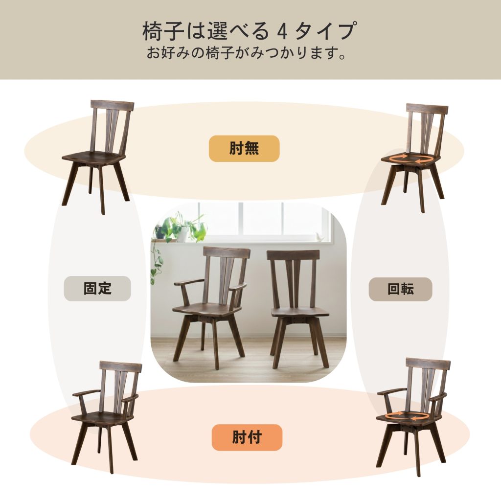 お好みに合わせて選べます。くるりと回して横からの出入りがしやすい回転チェアは椅子を大きく引く必要がないので、狭いスペースでも出入りが簡単です。
