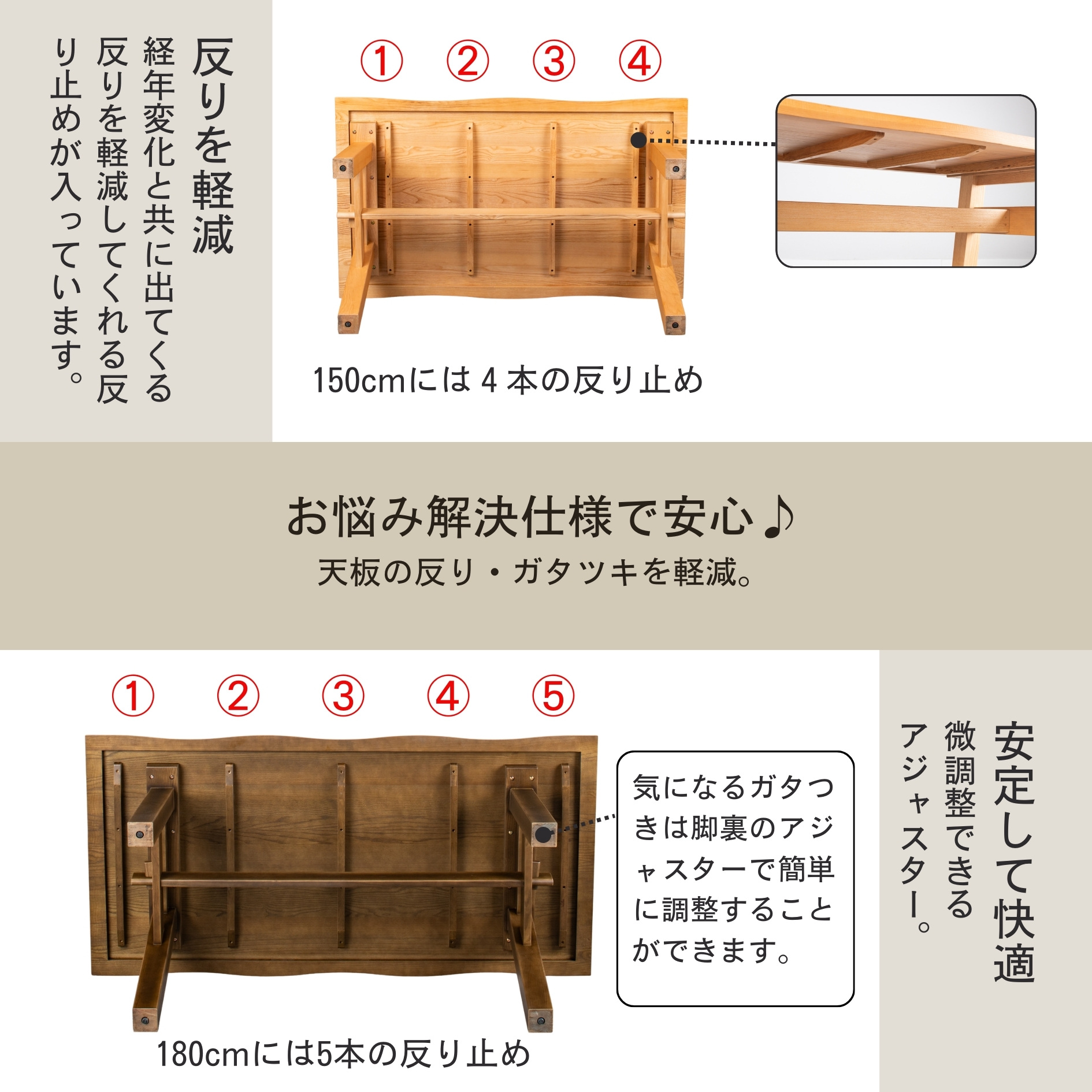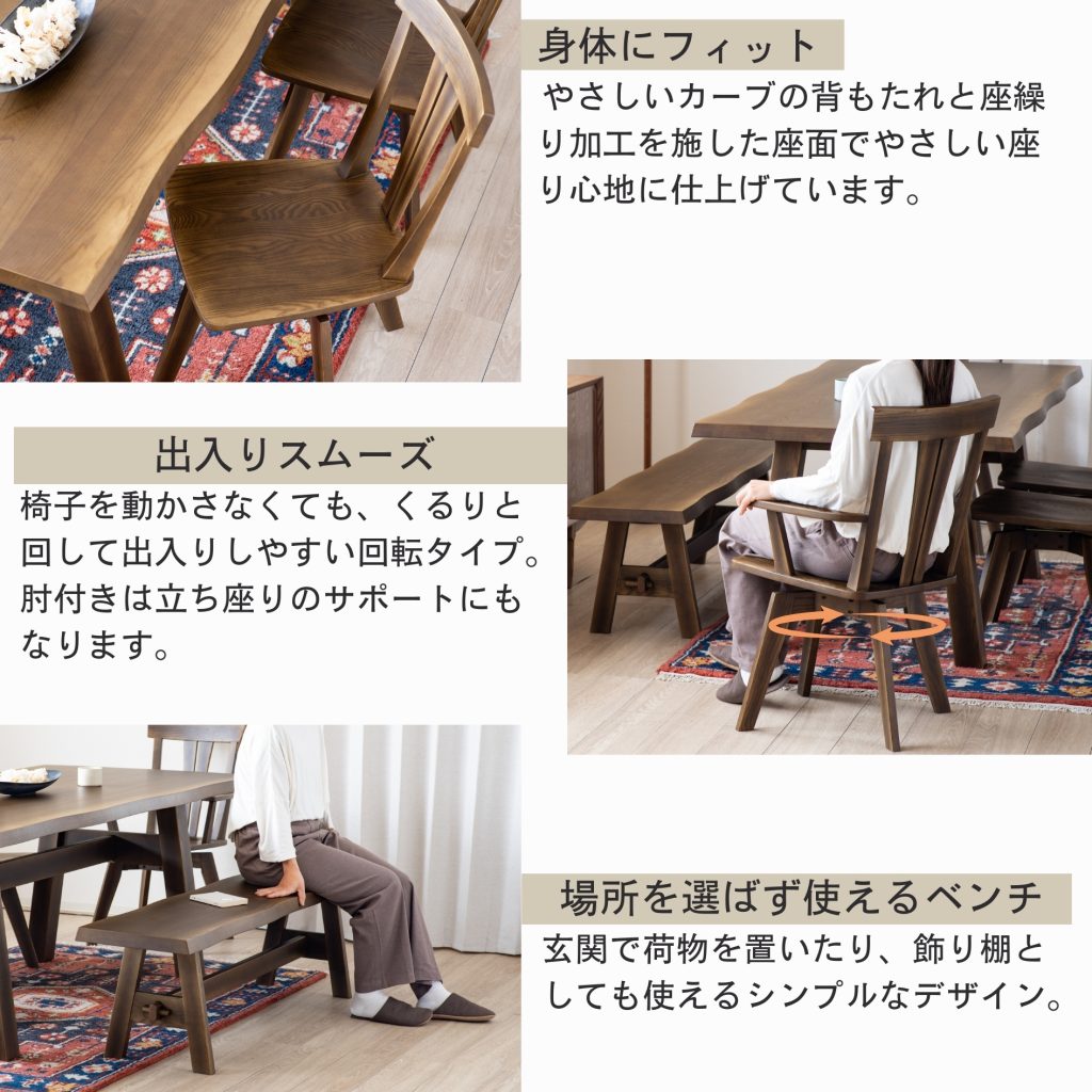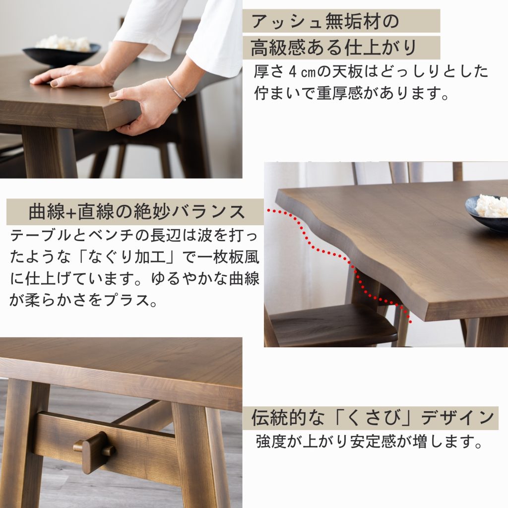 天然木アッシュ無垢材の質感が高級感のある仕上がり。厚さ4cmの天板はどっしりとした佇まいで重厚感があります。テーブルとベンチの長辺は波を打ったような「なぐり加工」で一枚板風に仕上げています。伝統的な「くさび」デザインは強度が上がり安定感が増します。