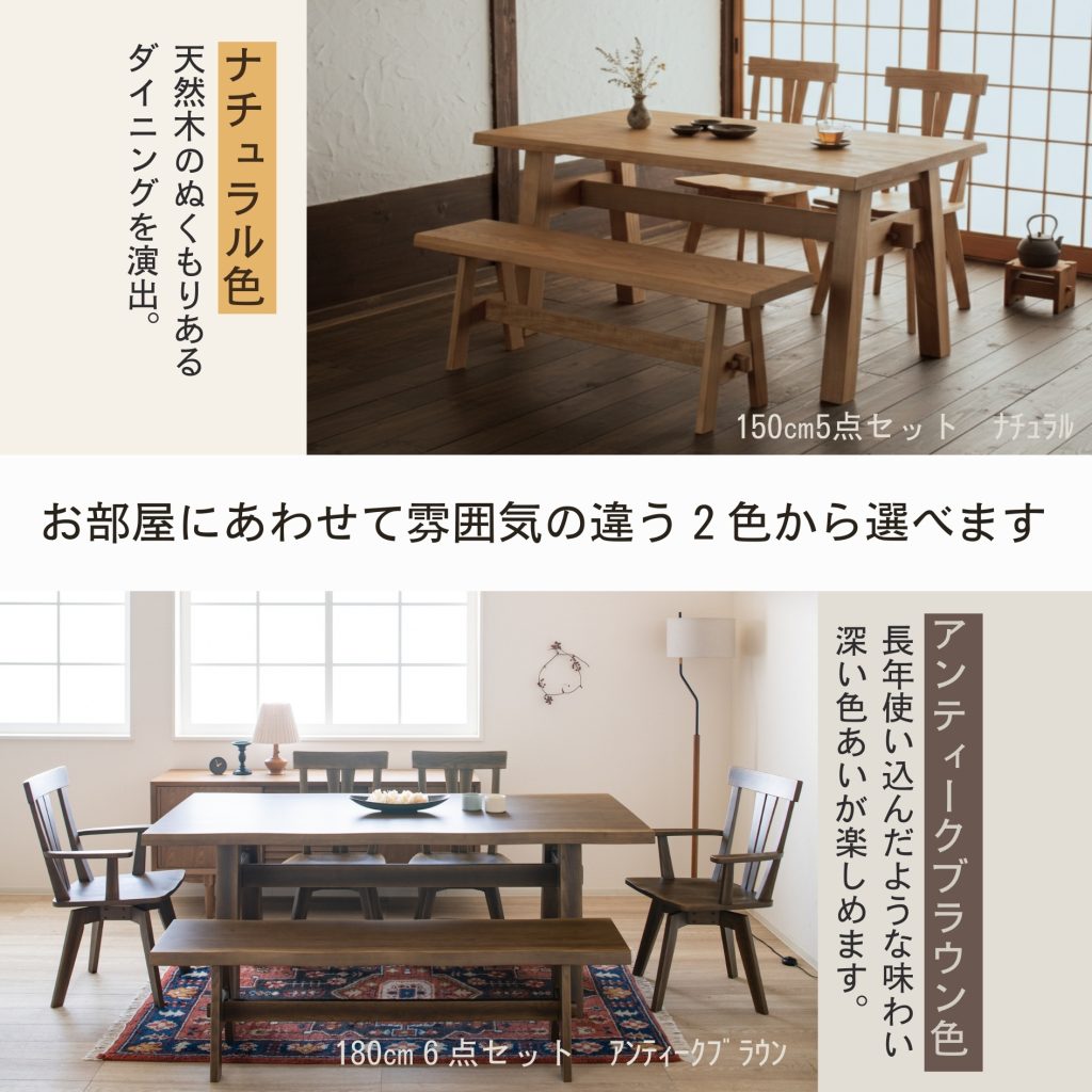爽やかな印象のナチュラル色と、長年使い込んだような味わい深い風合いに仕上げたアンティークブラウン色の2色展開です。