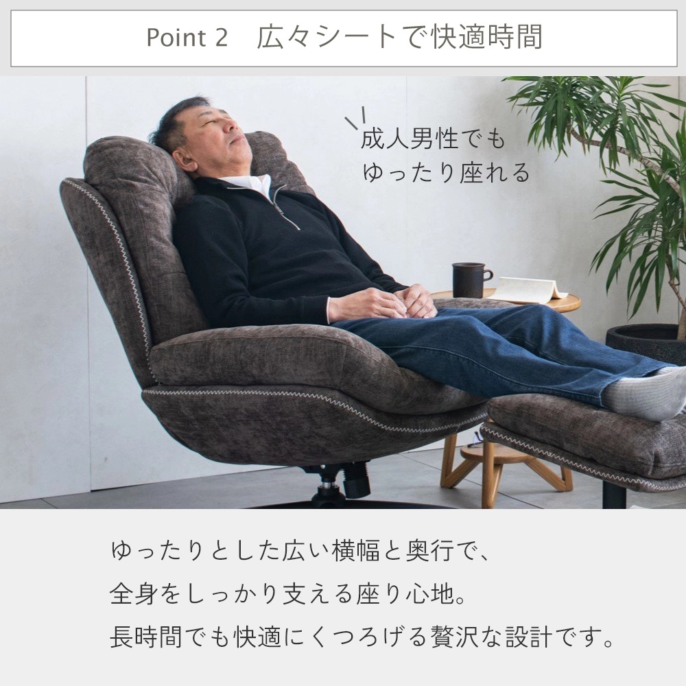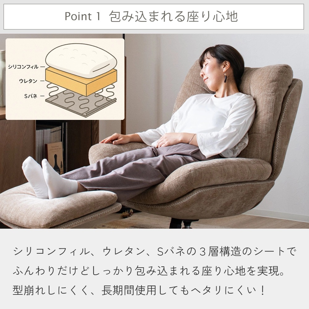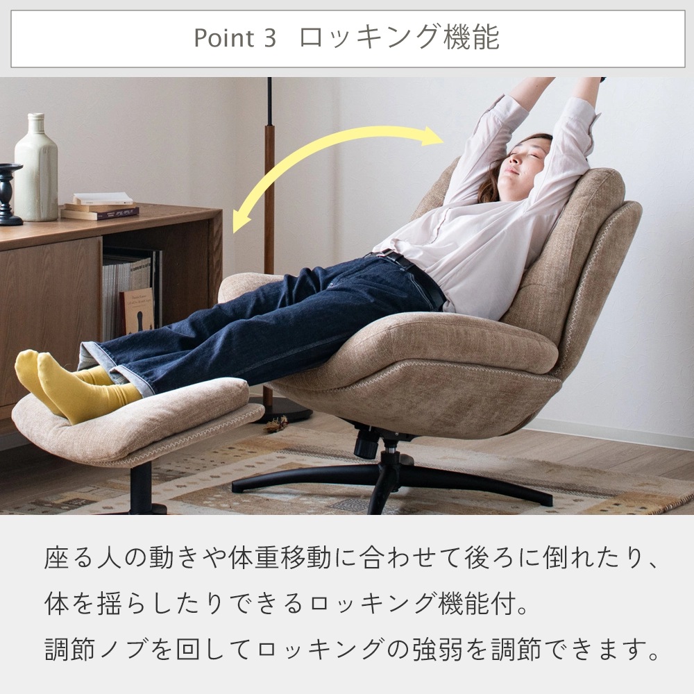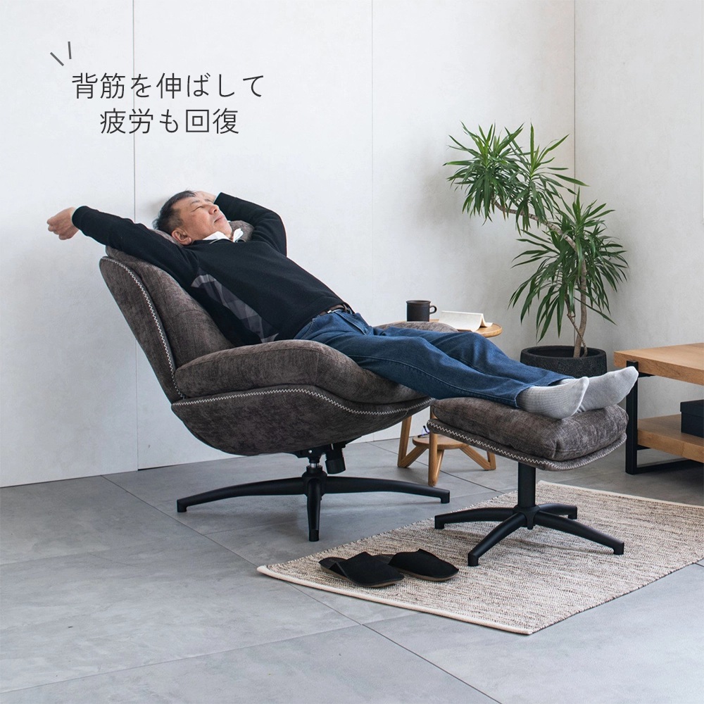 疲れた身体をソファーに預け、癒しのひと時を ご提供します。 カラーはインテリアに馴染みやすい3色を厳選。 ロッキング機能付きでリラックス効果を満喫。