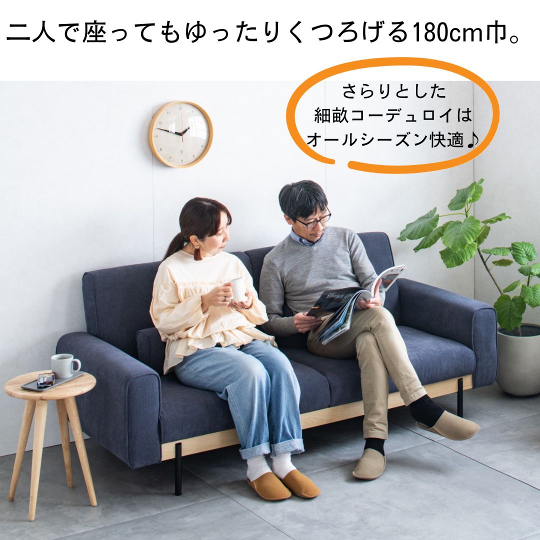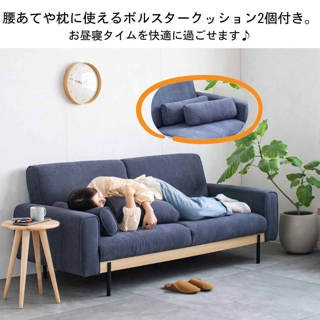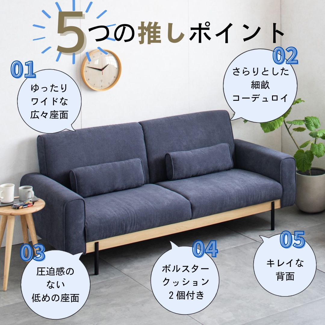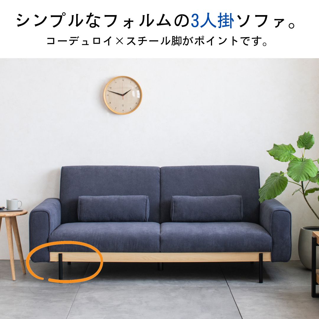 ロータイプの3Pソファー。 コーデュロイを使用した触り心地の良いソファー。 ボルスタークッション2ヶ付。 すっきりとしたスチール脚