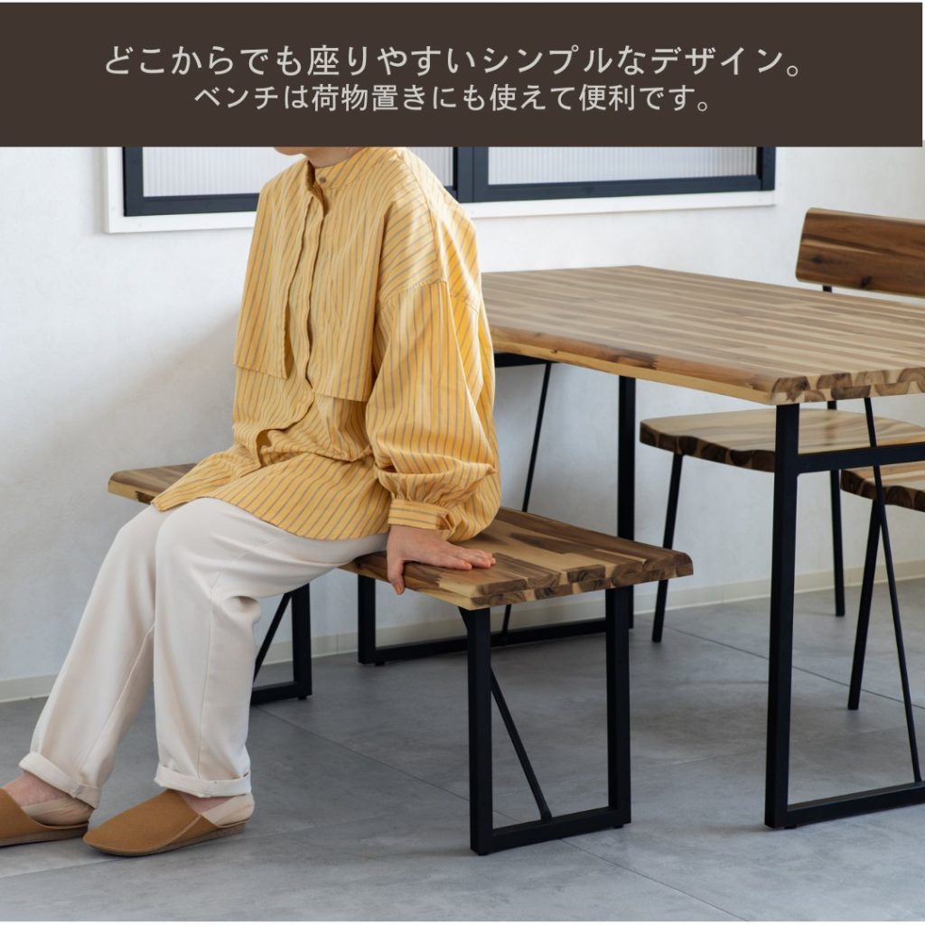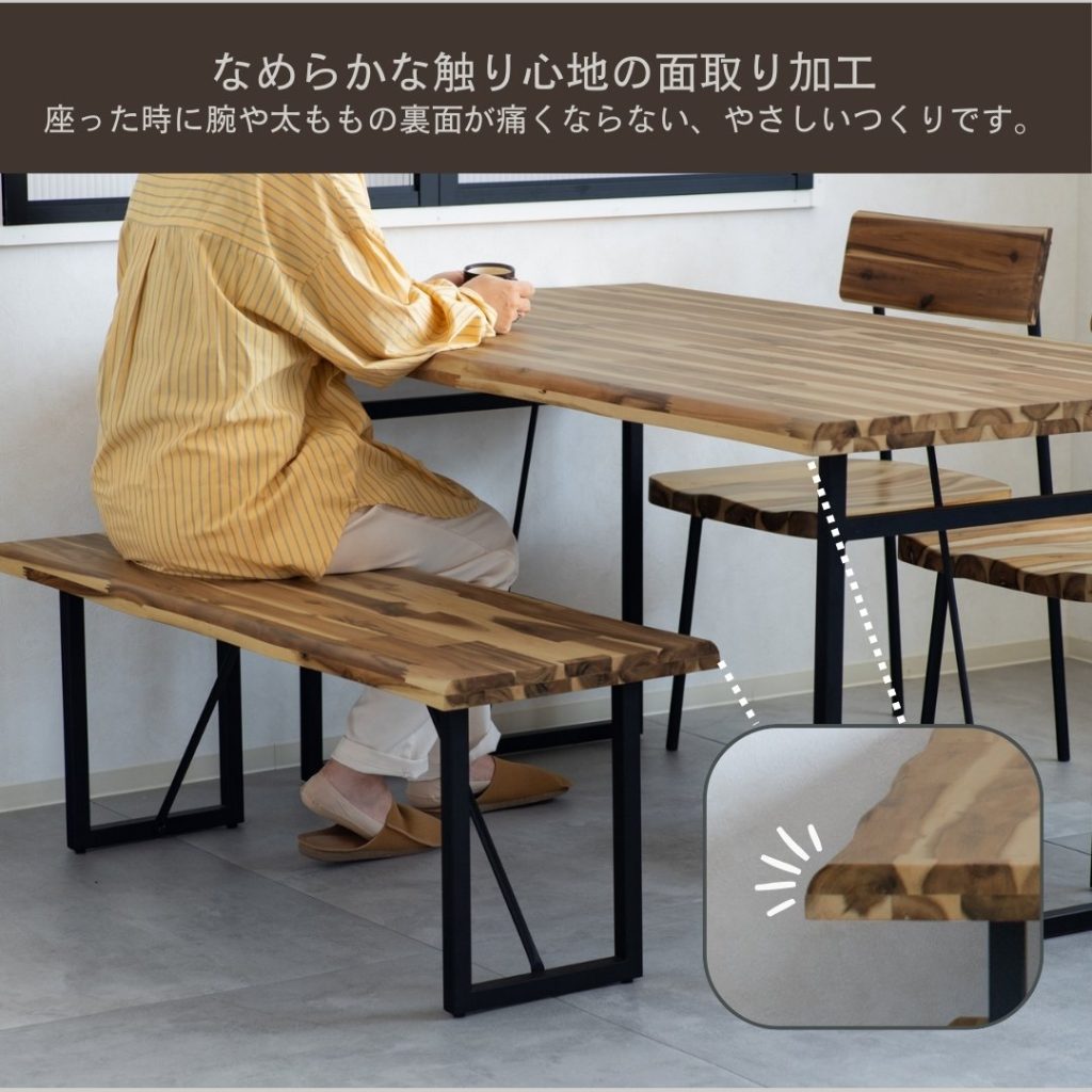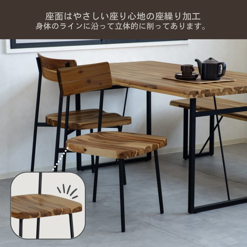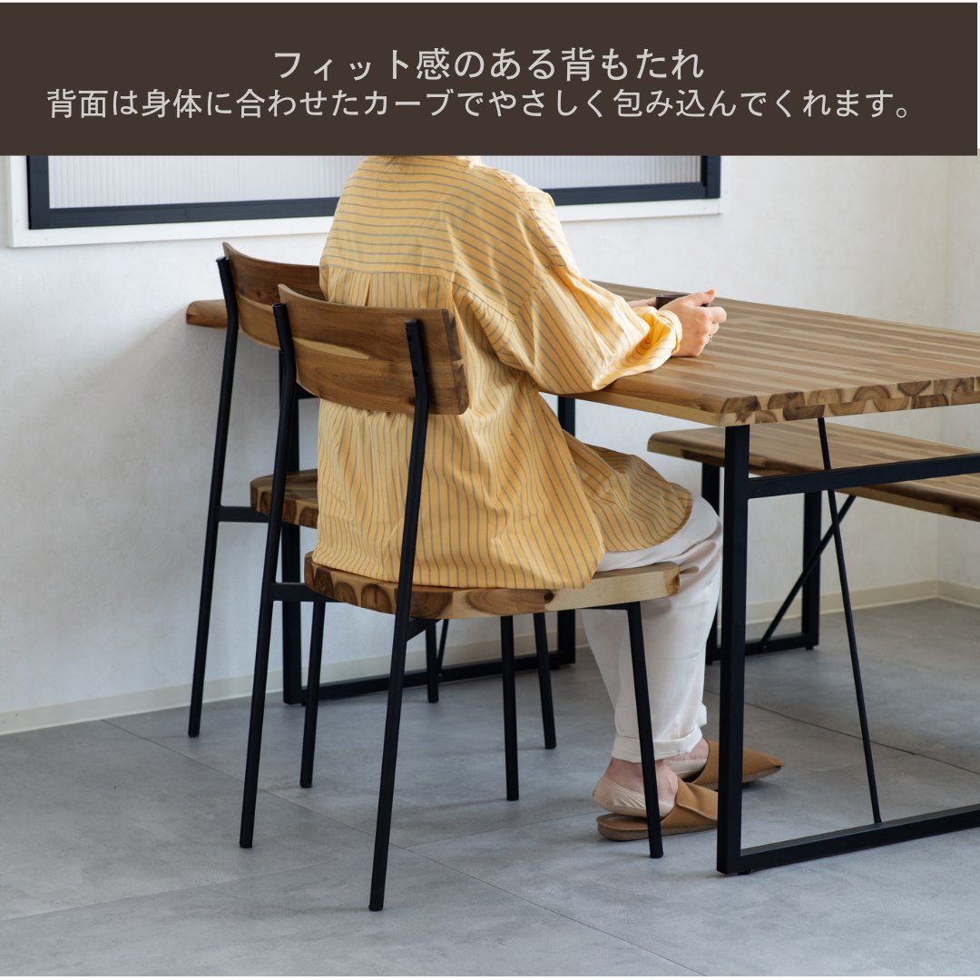 やさしいカーブの背もたれと座繰り加工の座面は身体のラインに沿って立体的に削ってあるのでやさしい座り心地です。ベンチはどちらからでも出入りしやすいシンプルデザインです。