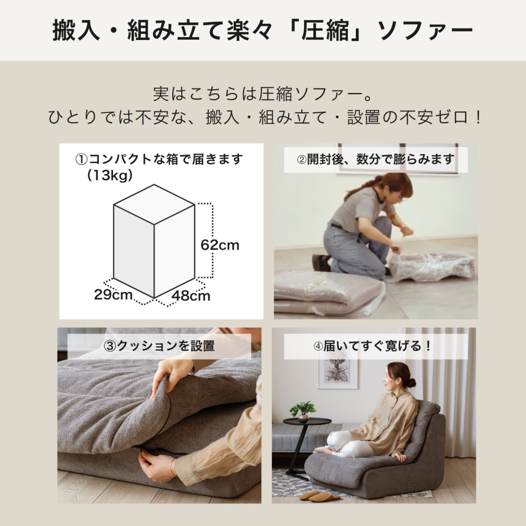圧縮してあるので持ち帰りラクラク!開けた瞬間、至福の座り心地。