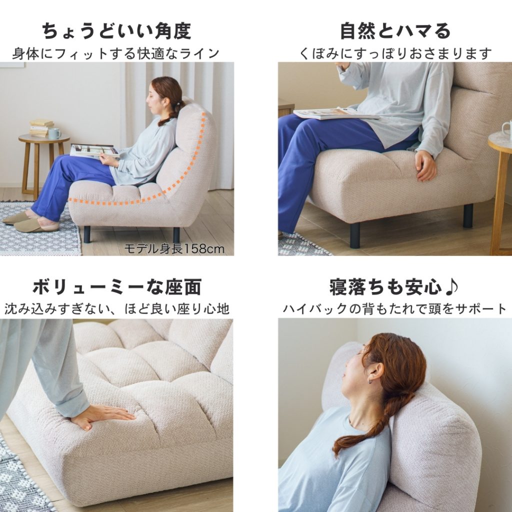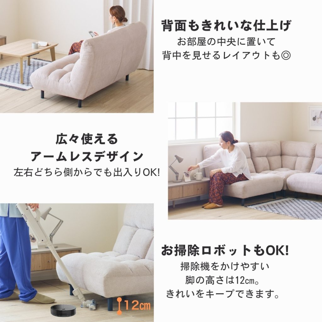 アームがないことで座面が広い、寝転びやすいのが魅力です。左右どちら側からでも座れるのも使いやすいポイントです。
