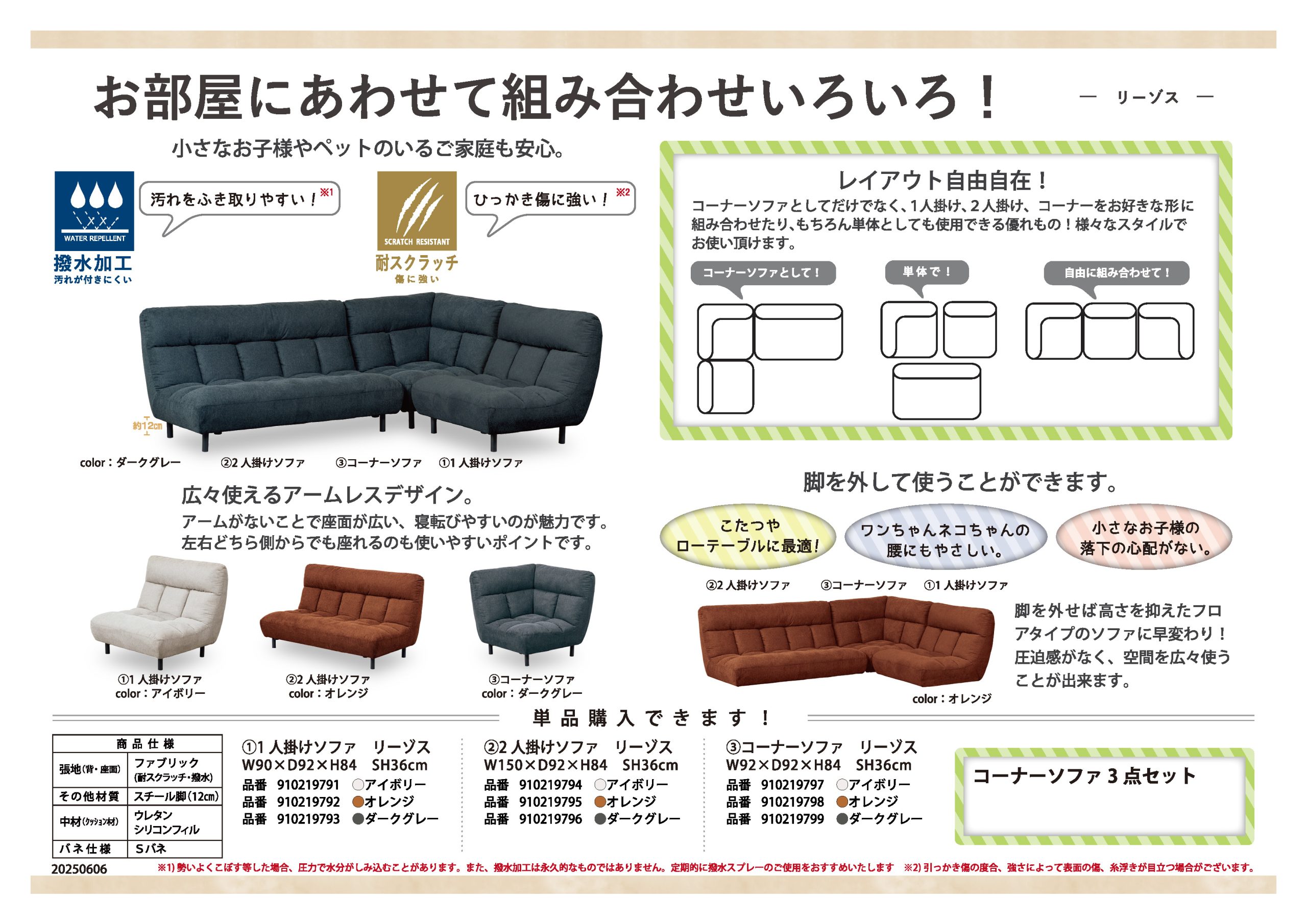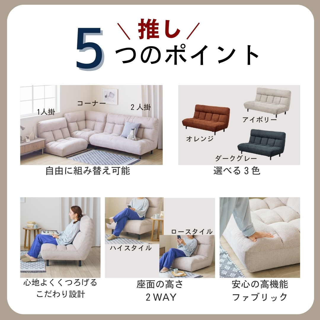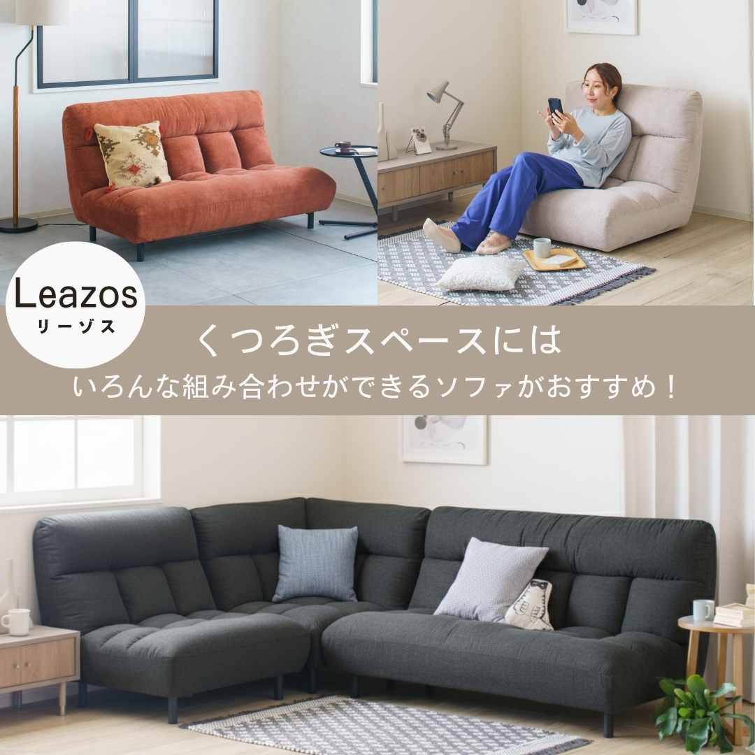 コーナーソファとしてだけでなく、1人掛け、2人掛け、コーナーをお好きな形に組み合わせたり、もちろん単体としても使用できる優れもの。様々なスタイルでお使いいただけます。