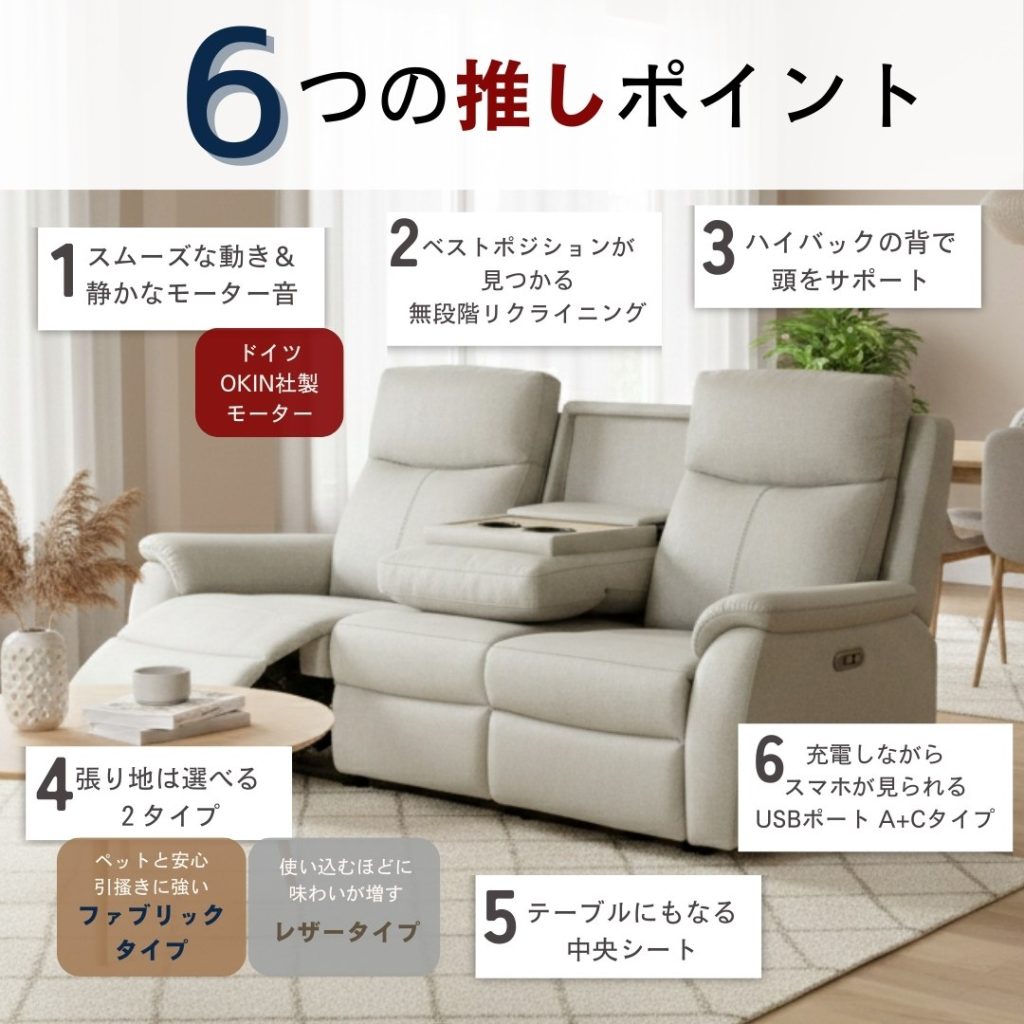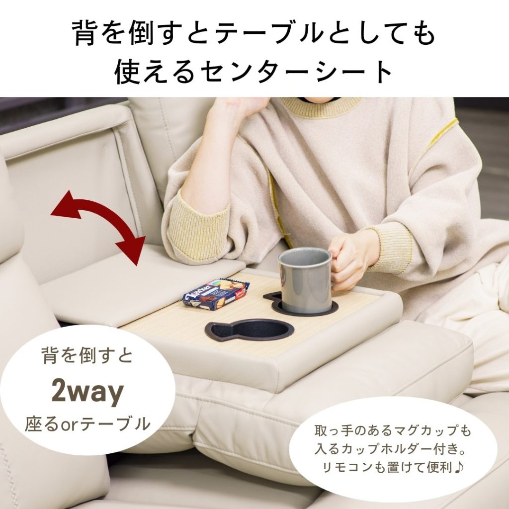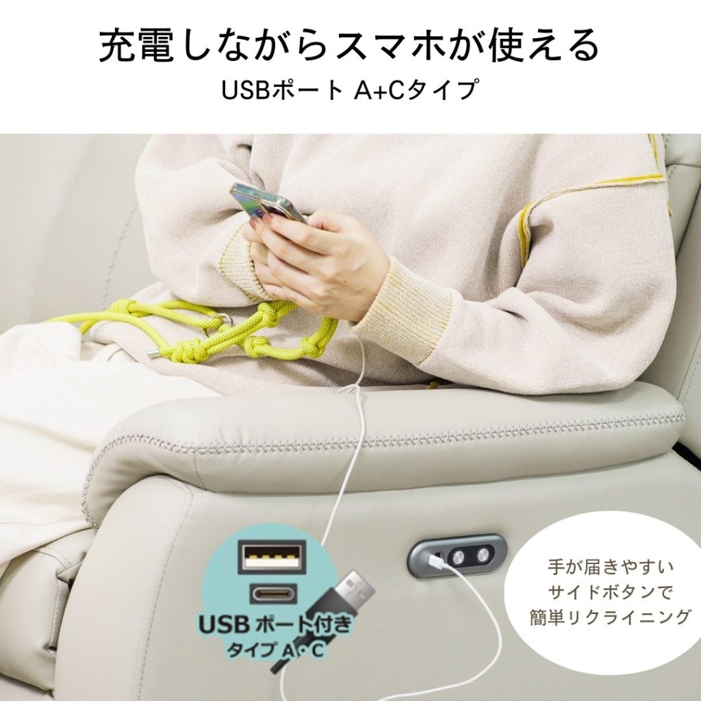 動かずに全てが完結、USBポート・テーブル付きの電動ソファです。