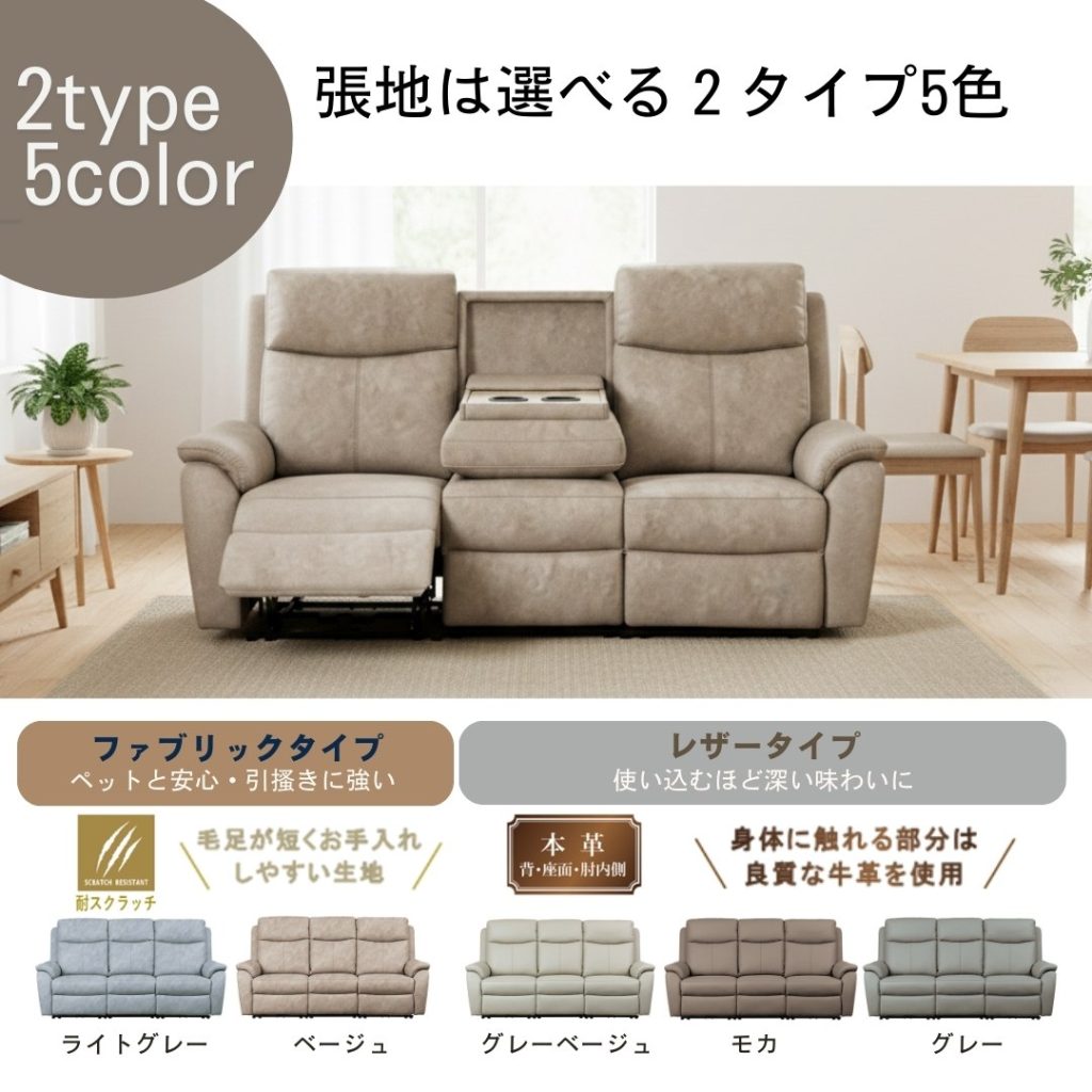 張地:・ファブリックタイプ(ライトグレー・ベージュ)…引っかき傷に強く、毛足が短くお手入れしやすいので、ペットのいるご家庭にも。