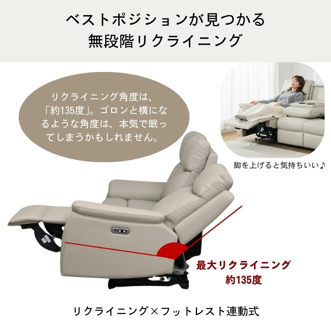 動かずに全てが完結、USBポート・テーブル付きの電動ソファです。