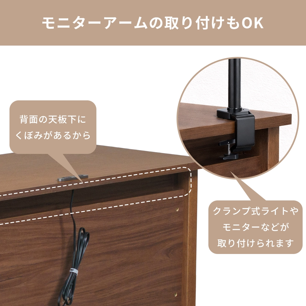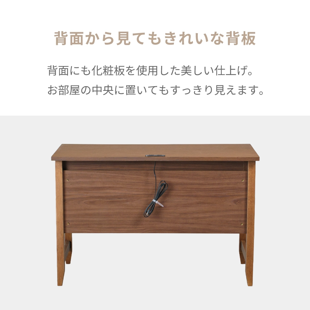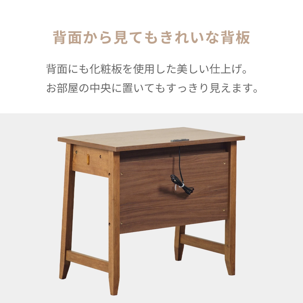 天板にはコンセント2口付き、引き出しは奥まで出し入れが出来るフルオープンレール仕様、両サイドには使わない時は収められる格納式フック付きです。