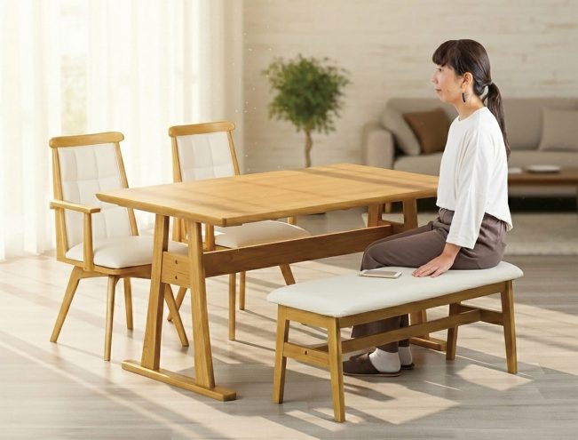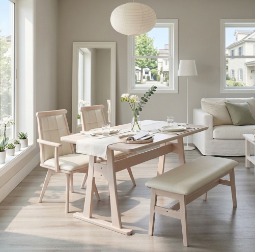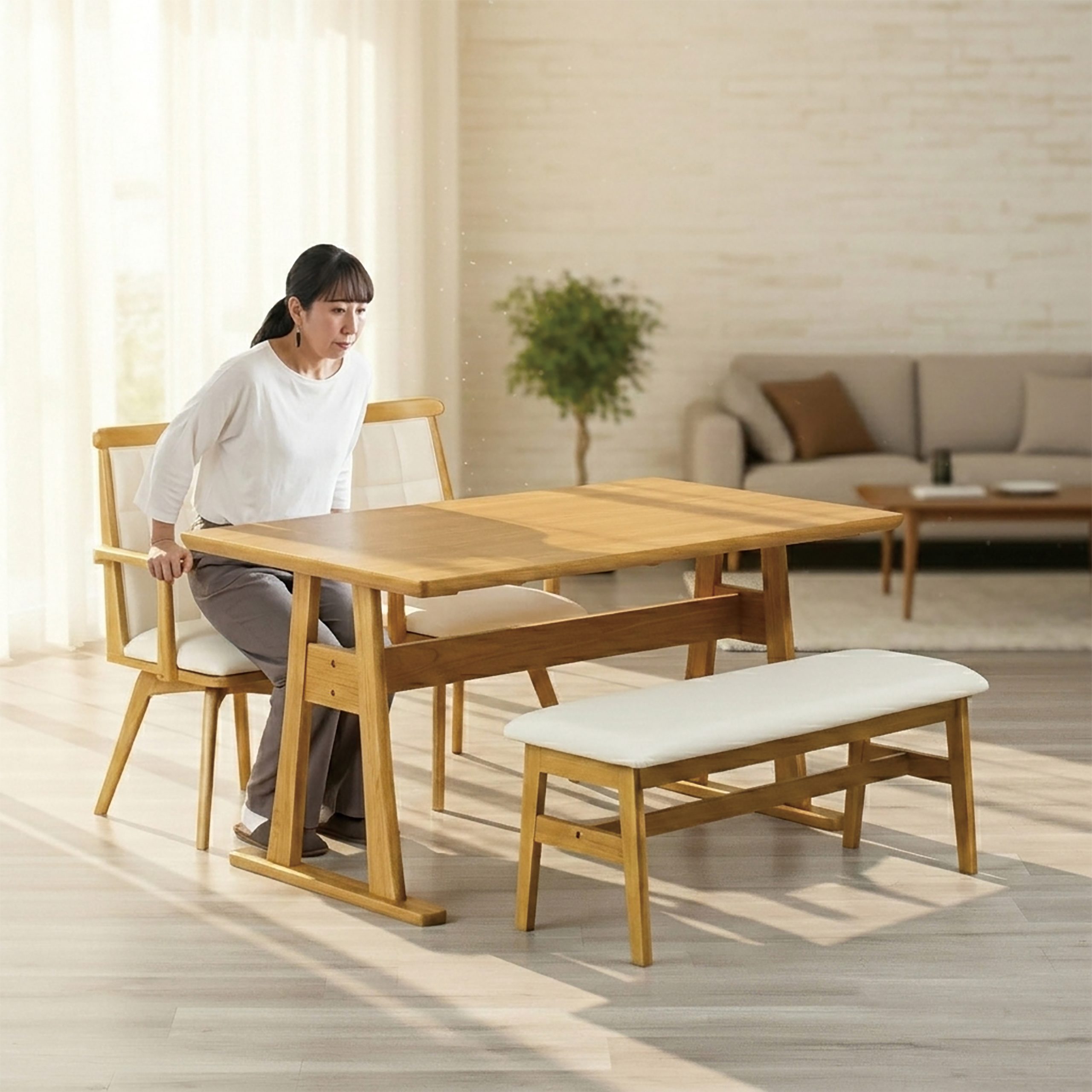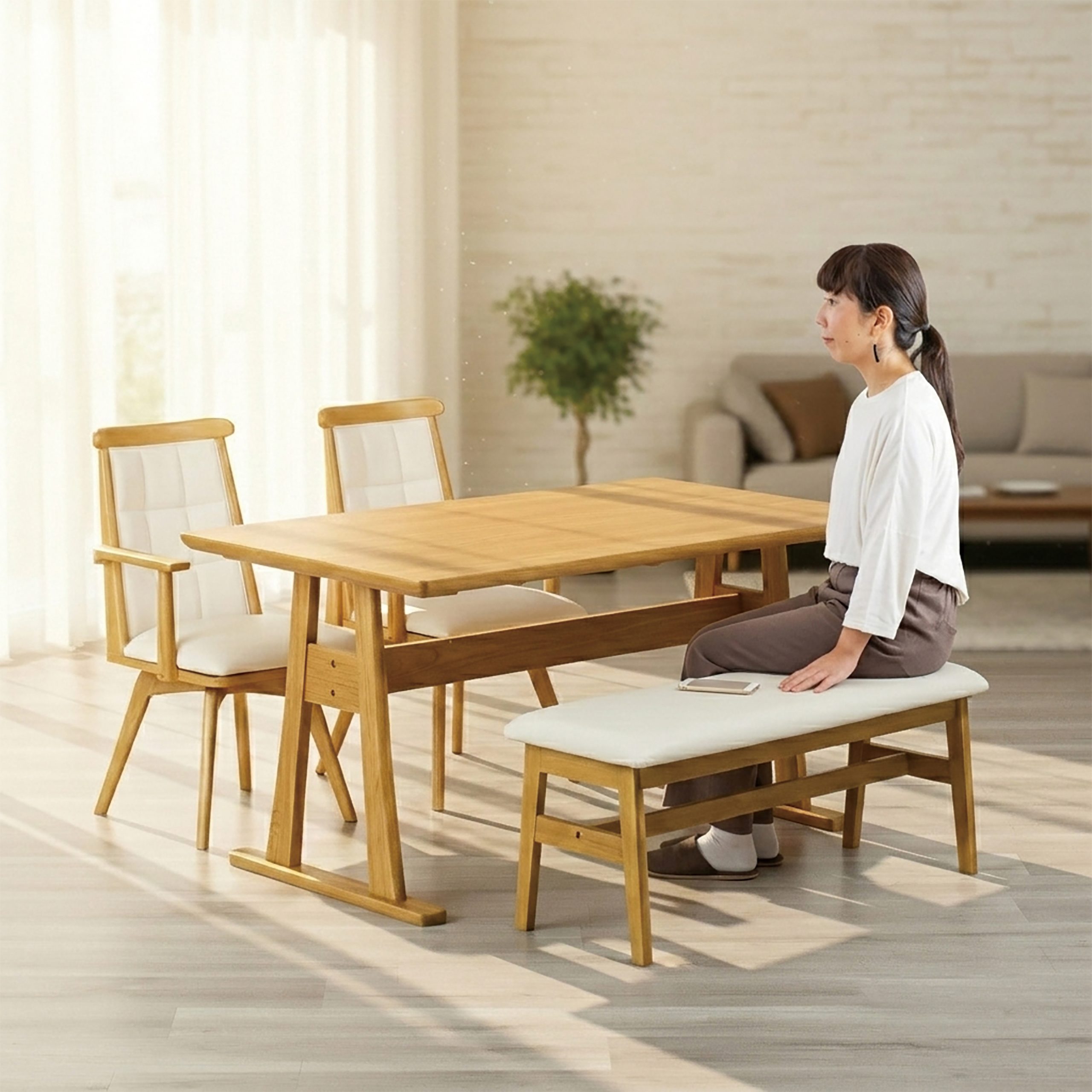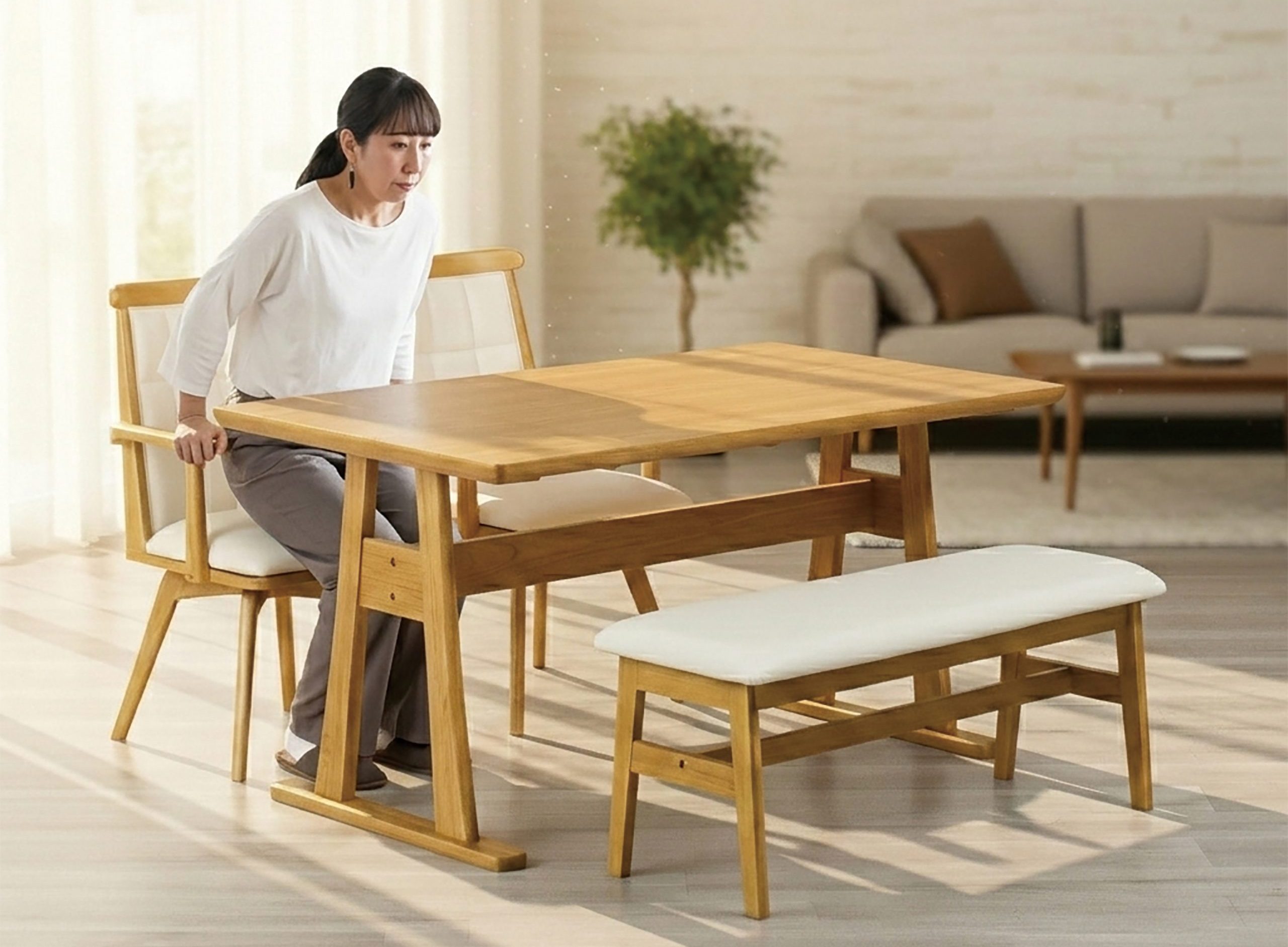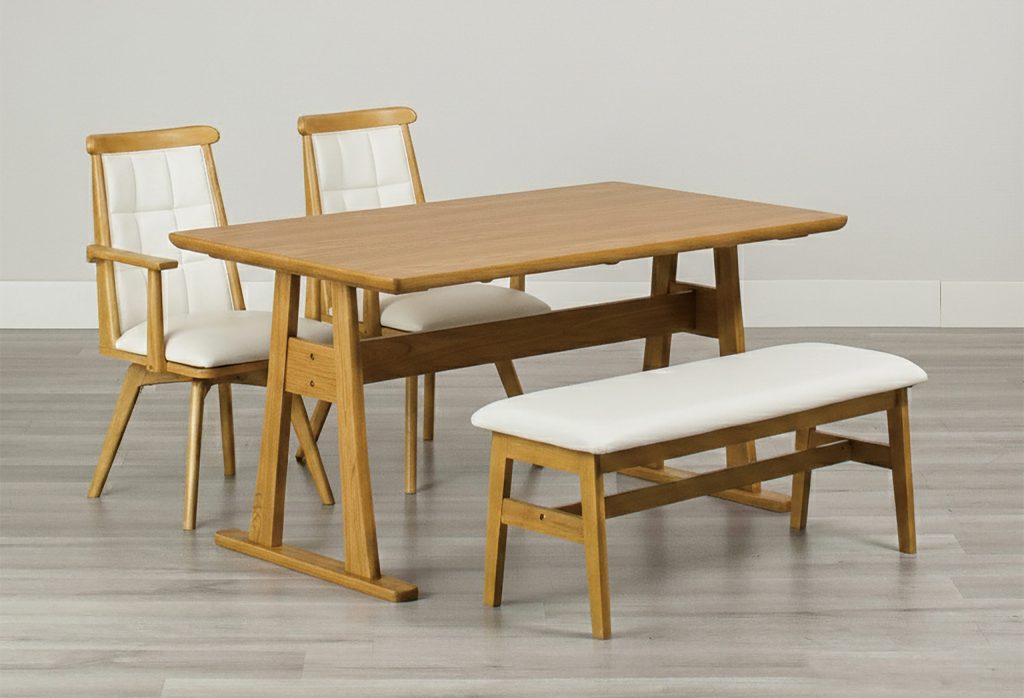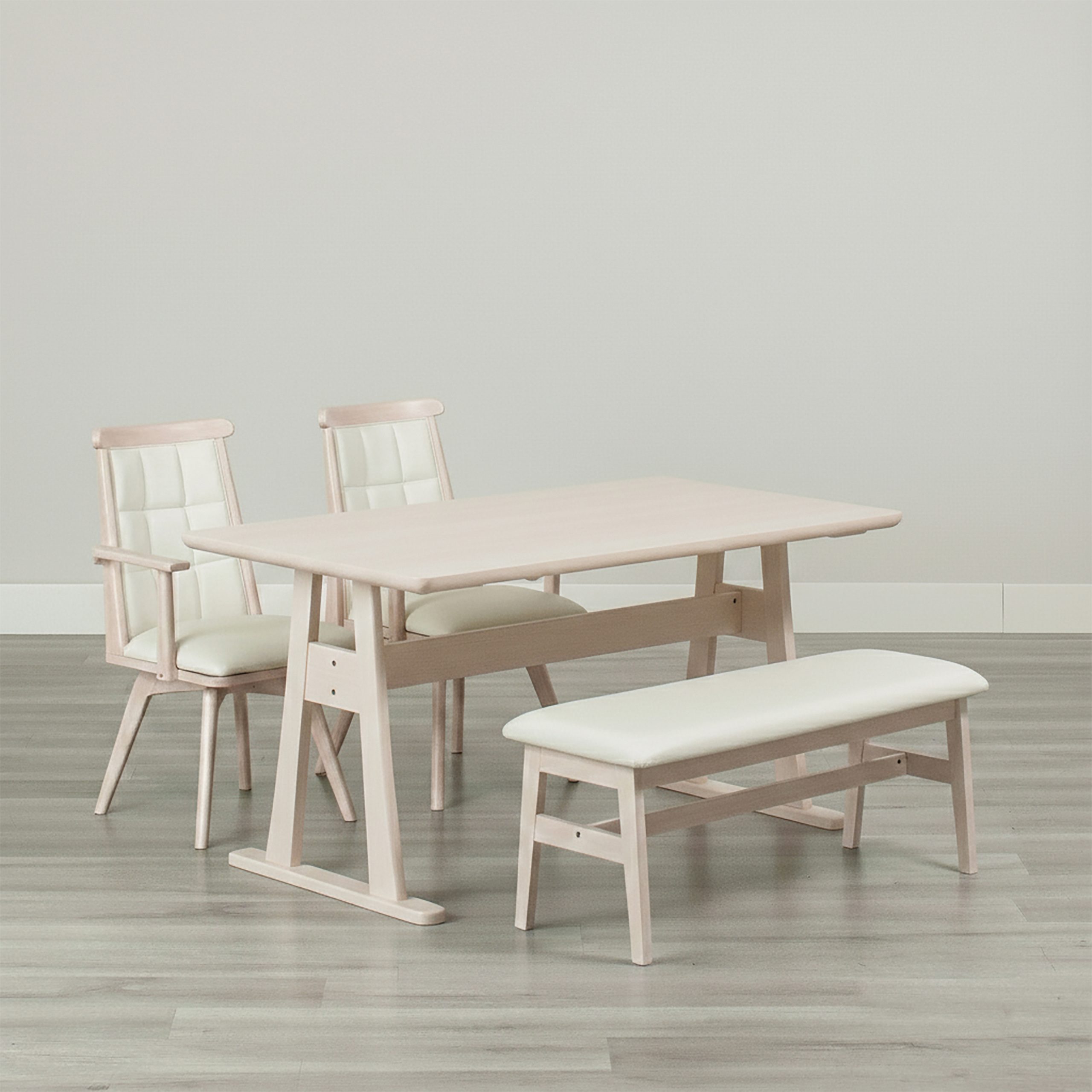 天板はウレタン塗装。チェア&ベンチは合成皮革張りなので、お手入れもラクチンなのも魅力です。