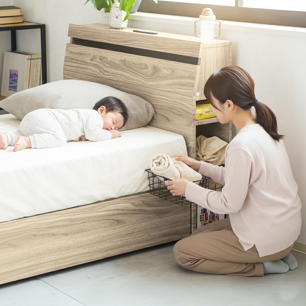 防災グッズ以外にも、赤ちゃんの寝かしつけグッズやおむつなどすぐ必要なものを収納も可能