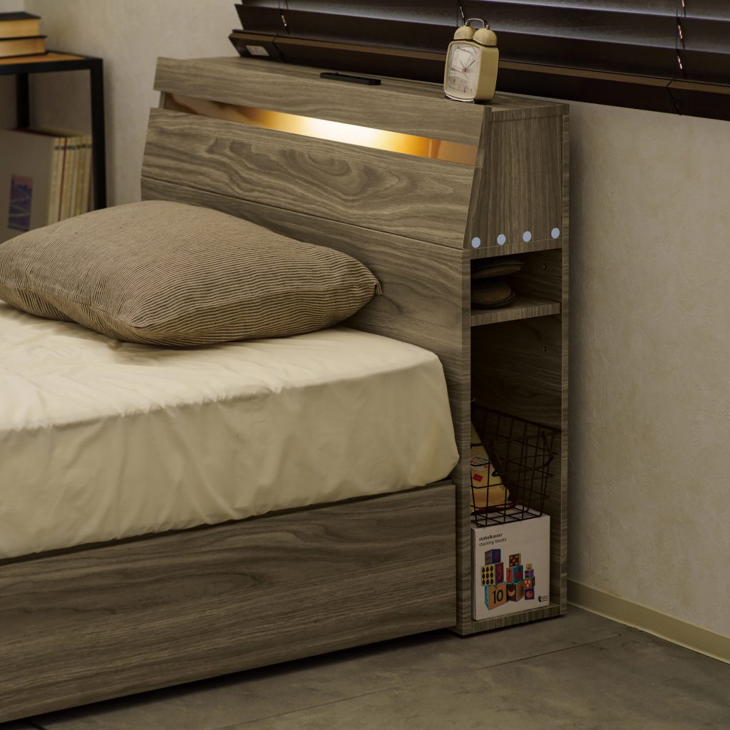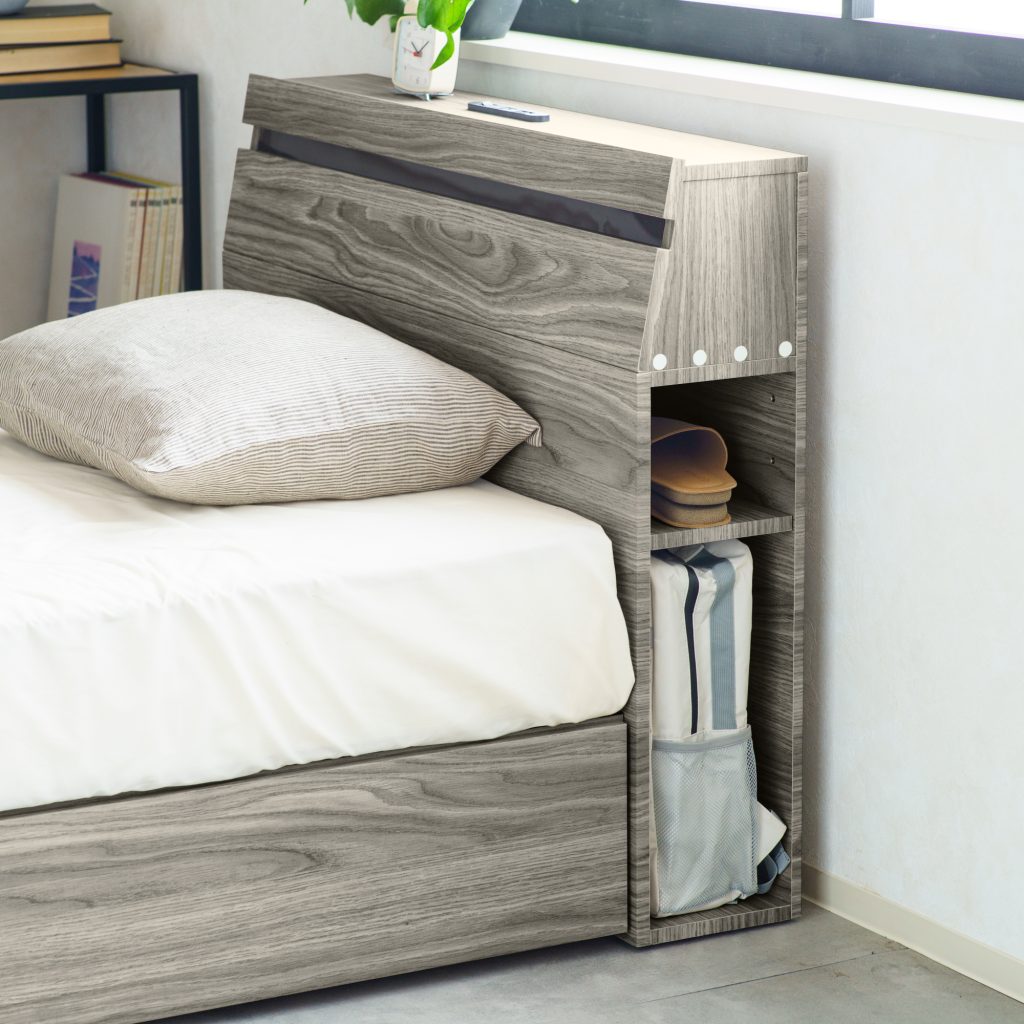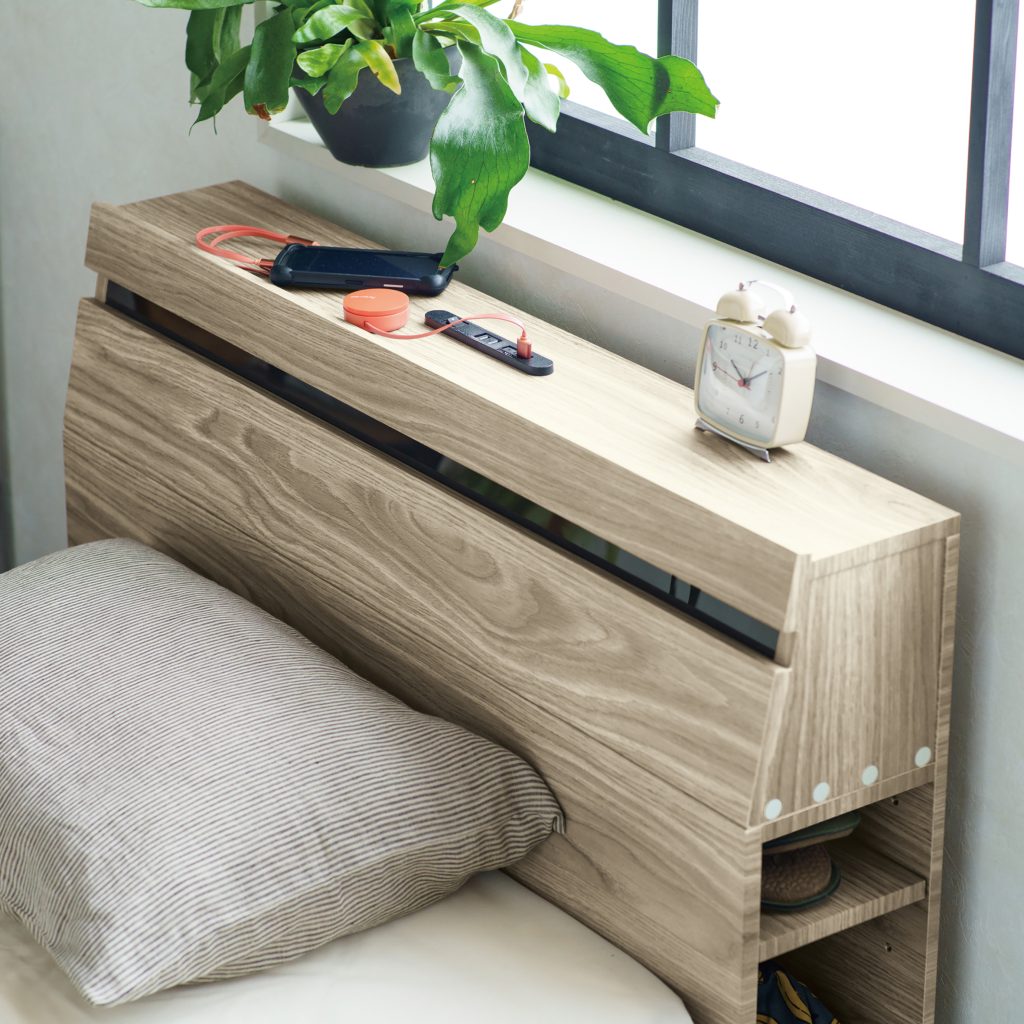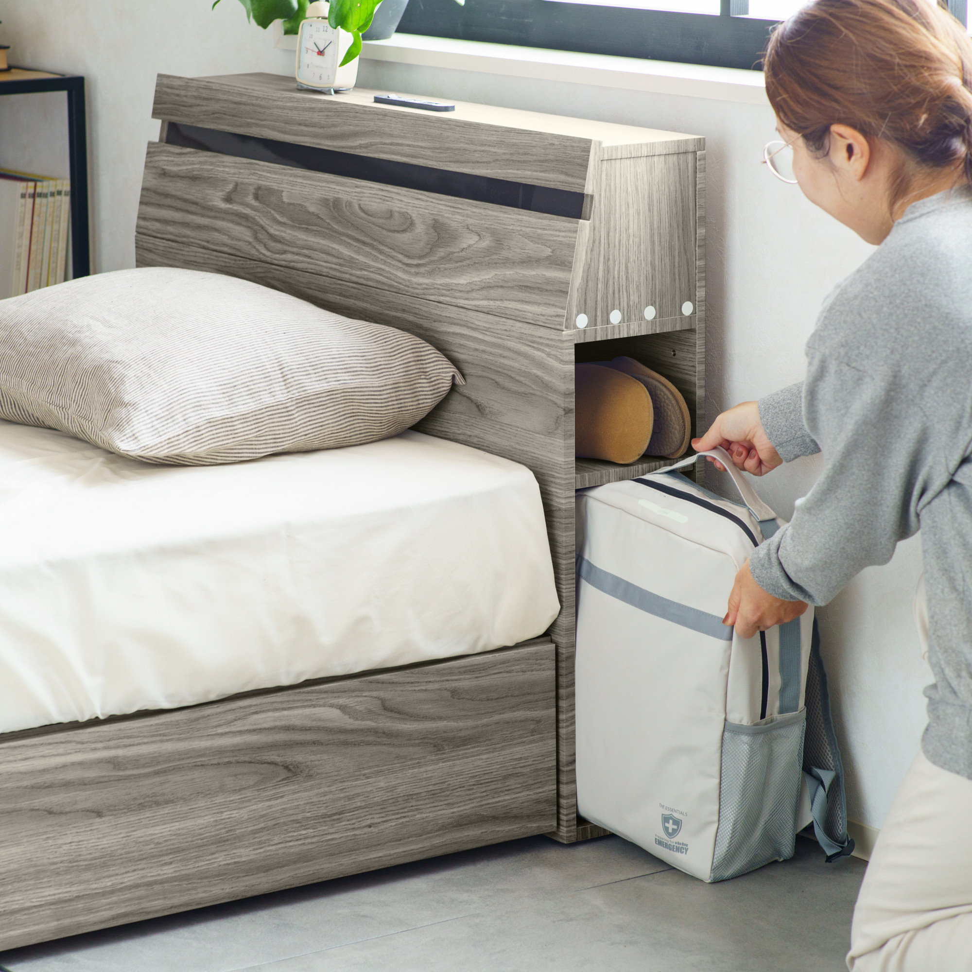 寝ている間も、備えはすぐそばに。いざという時探さなくてもいい備えを枕元のスペースに収納。